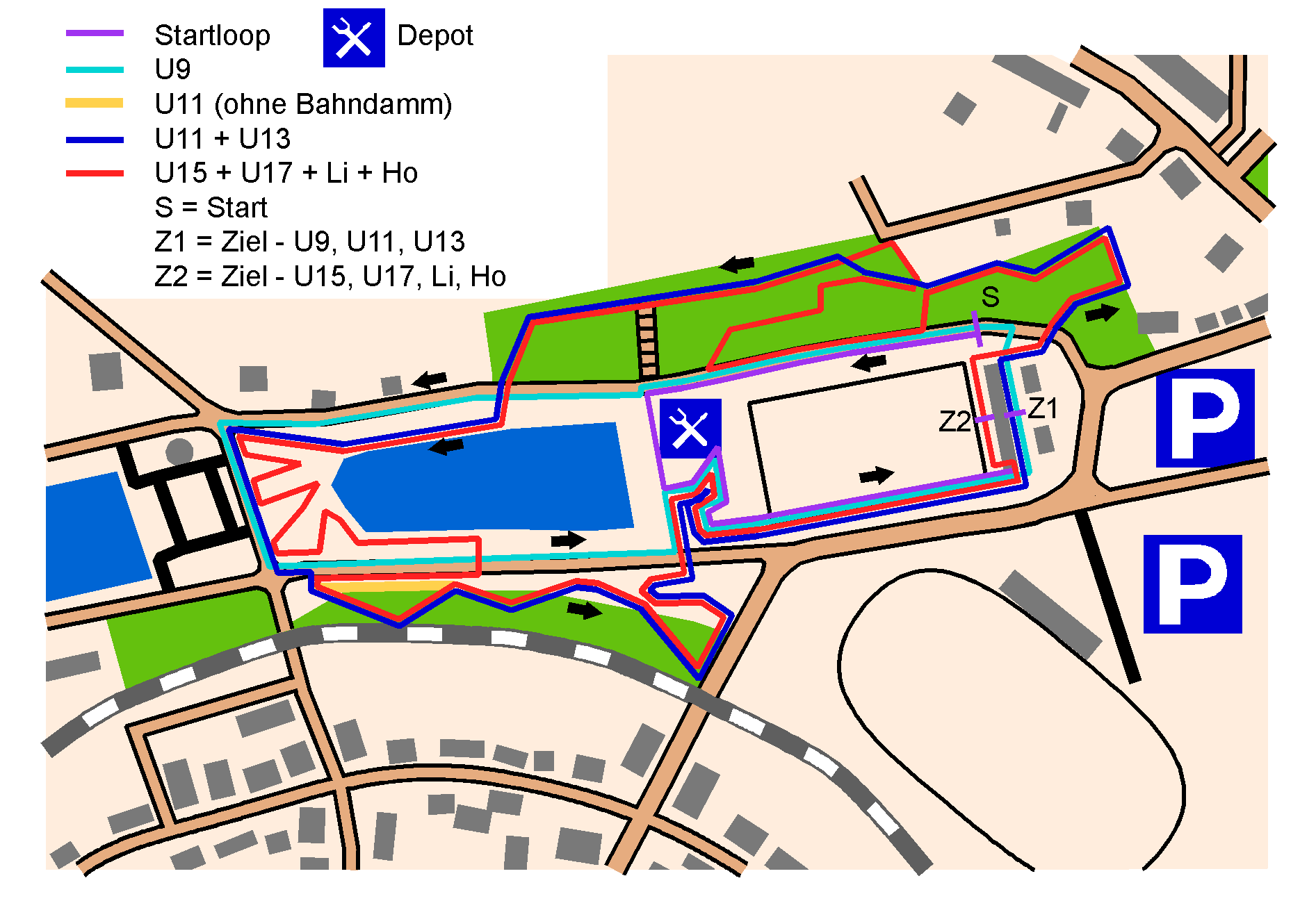 > Ziel: Es gibt zwei verschiedene Zieldurchfahrten. Die Klasse U9, U11 und U13 haben ihren Rundendurchlauf und ihre Zieleinfahrt oben am Stadioneingang. Alle anderen Klassen haben ihren Rundendurchlauf und ihre Zieleinfahrt unten am Stationgebäude nach Abfahrt der Treppe.